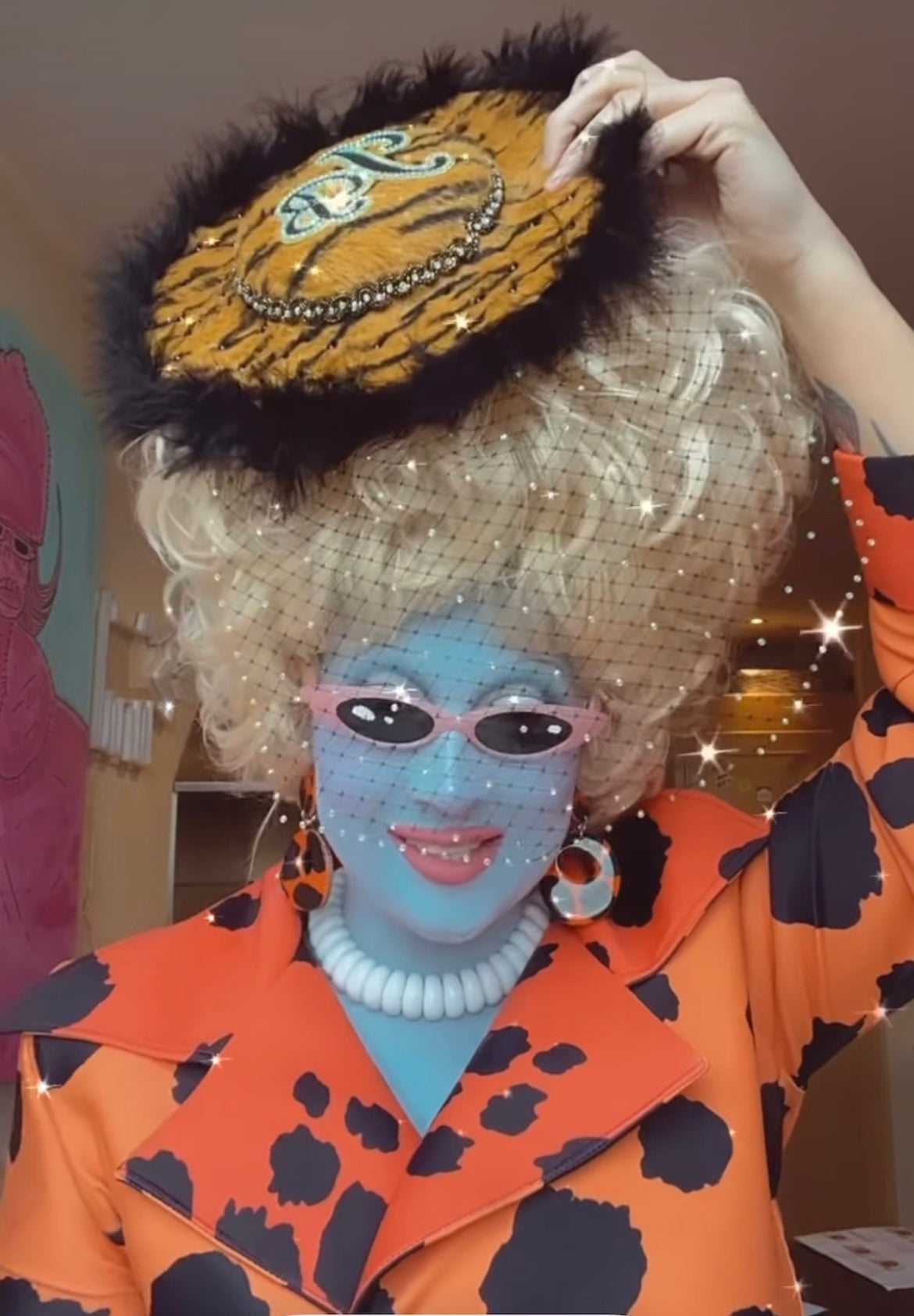 I went for a fascinator style hat and added faux fur tiger print material as the base, personalised the hat with rhinestone initials JB and of course threw on a rhinestone veil for added drama!