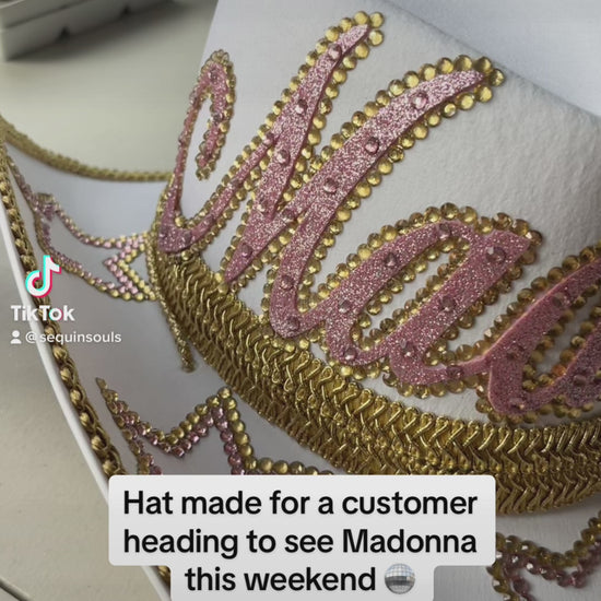 This stunning white cowboy hat is decked out with pink and gold rhinestone stars and ready to be personalised with your name, initials, lucky number, or favourite symbol — just tell us what you want!
