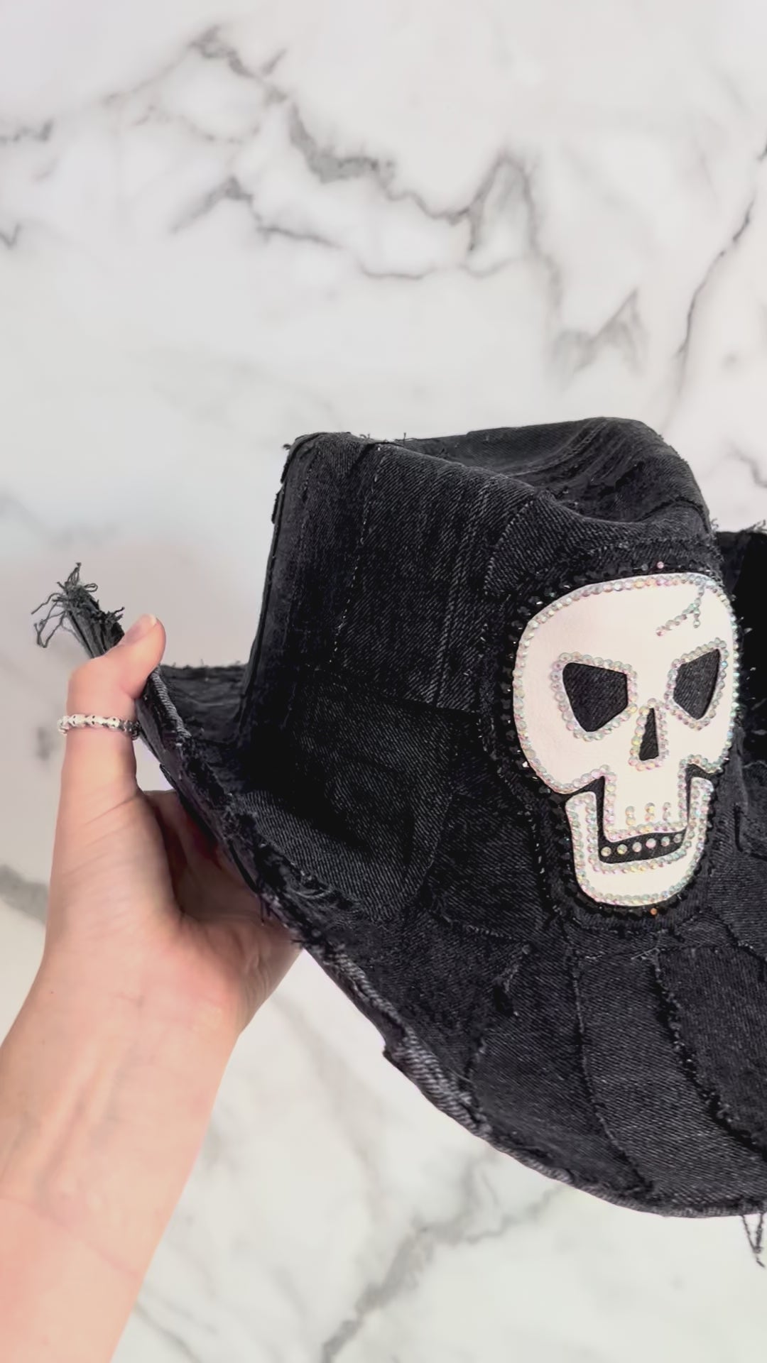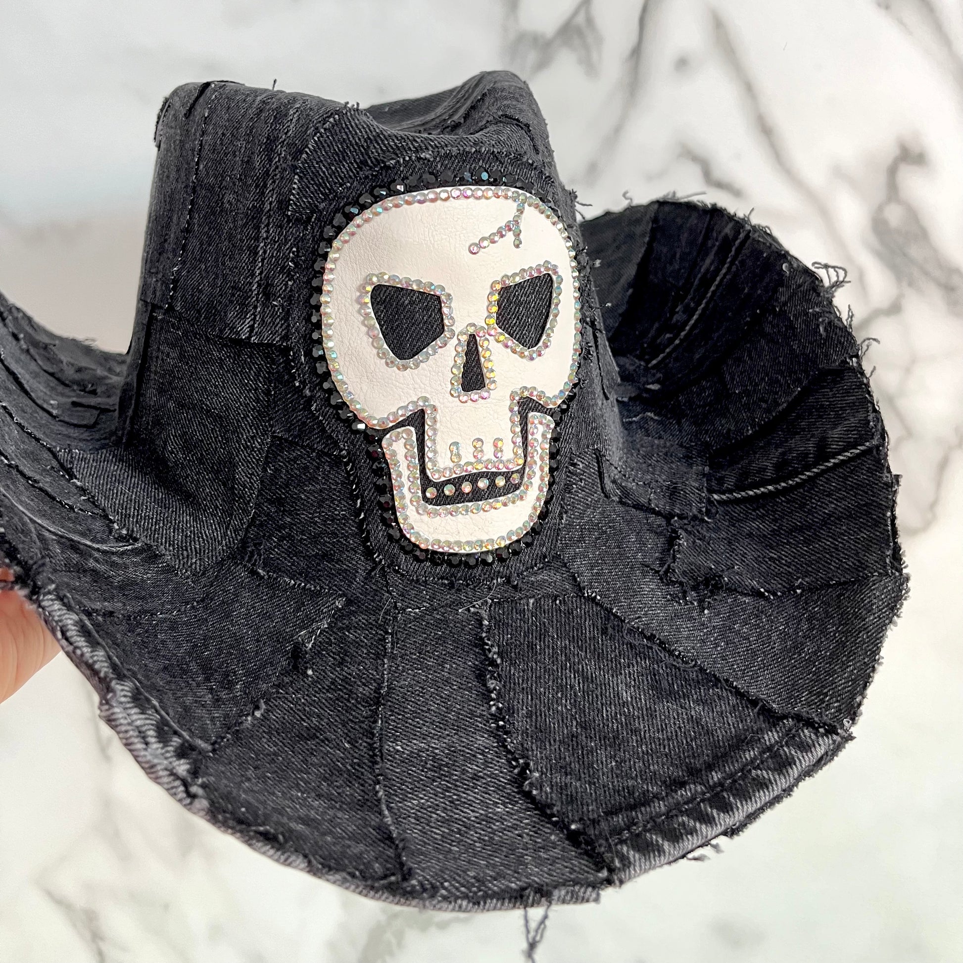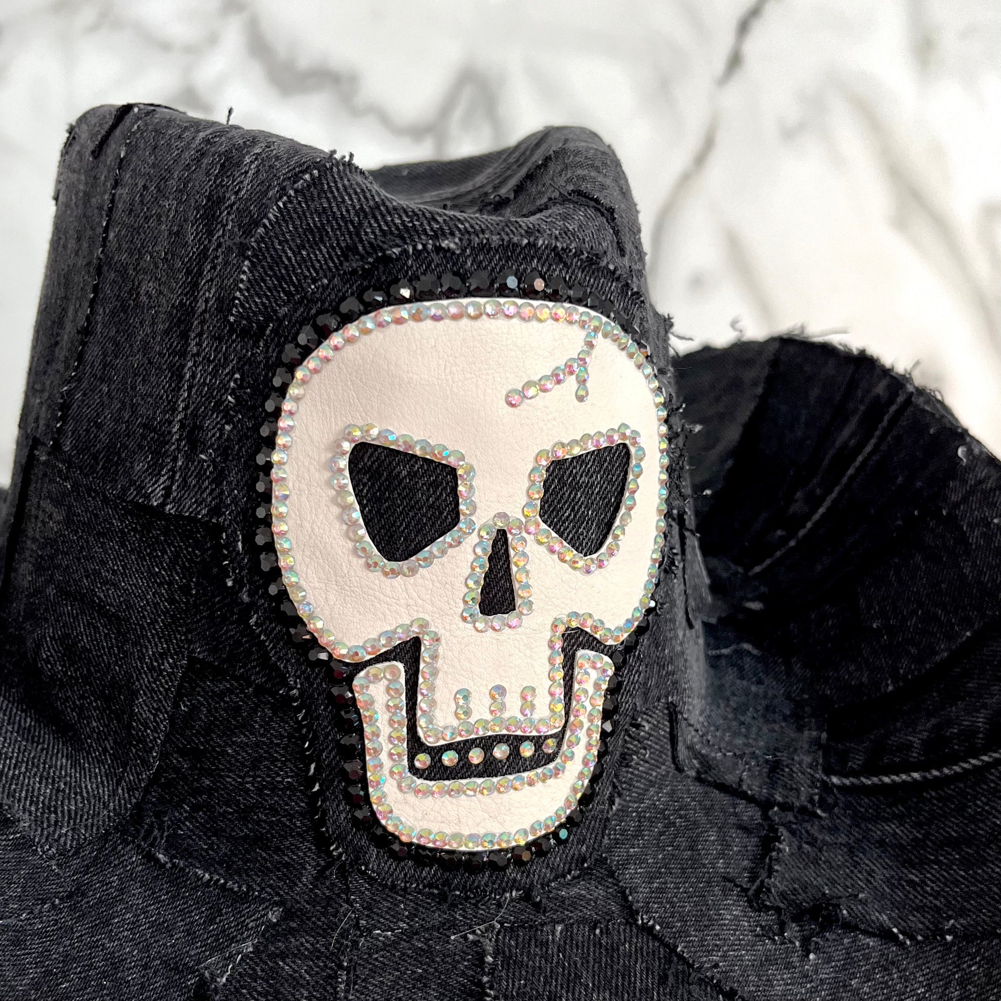 Preloved denim meets spooky-season glam in this rhinestone-studded cowboy hat.