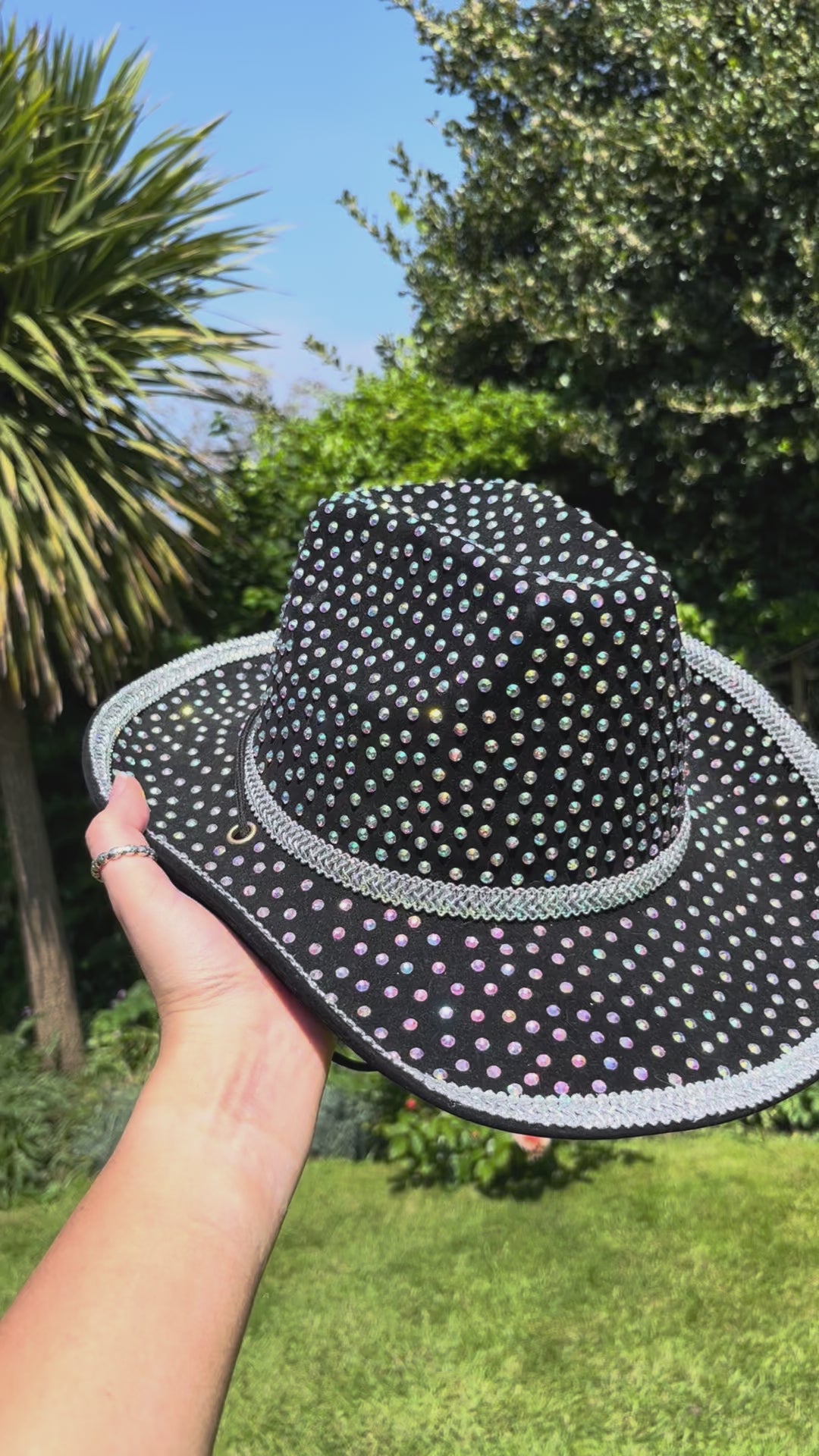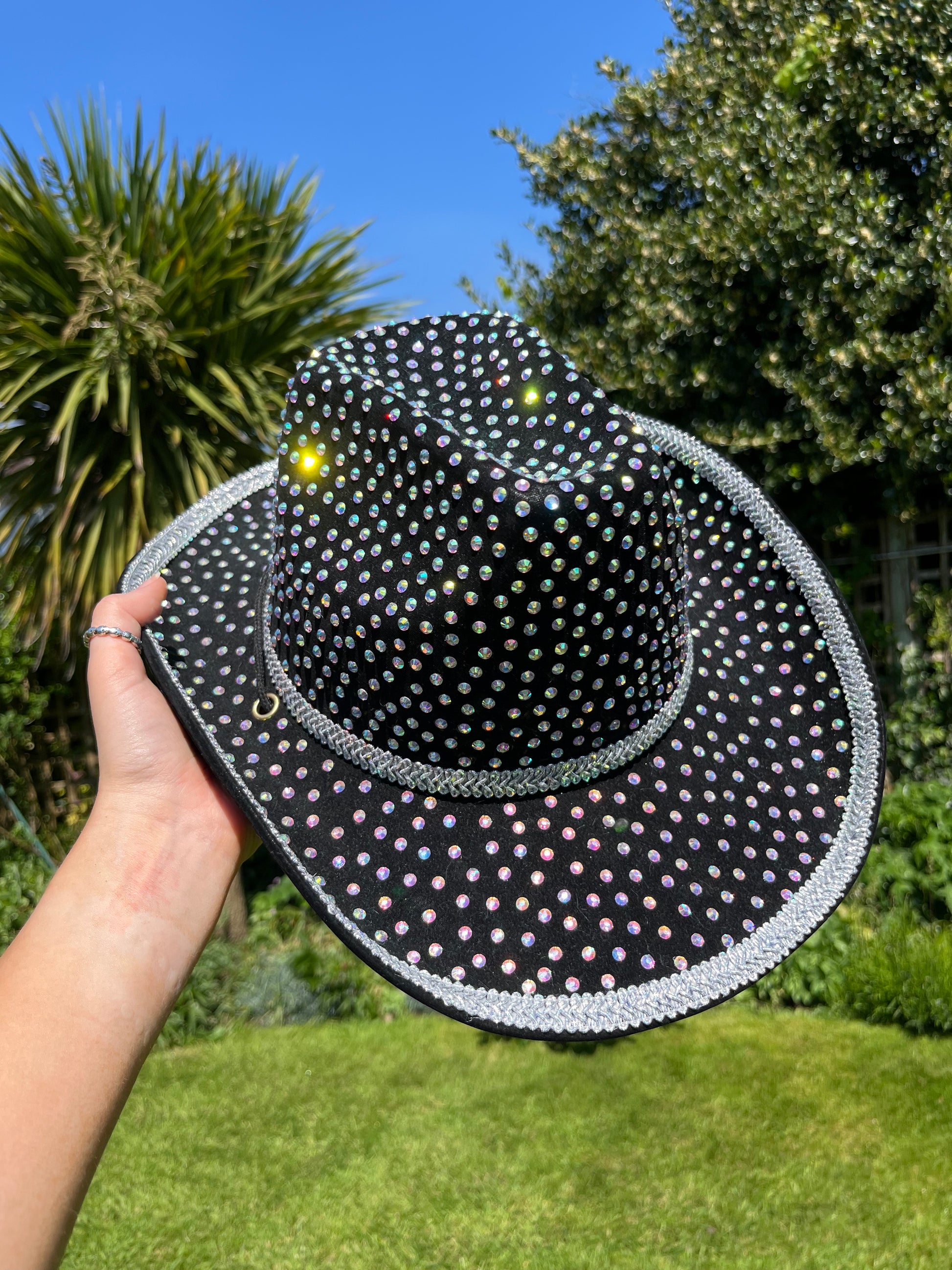 Black Suedette Cowboy Hat with Iridescent Rhinestone Embellishments