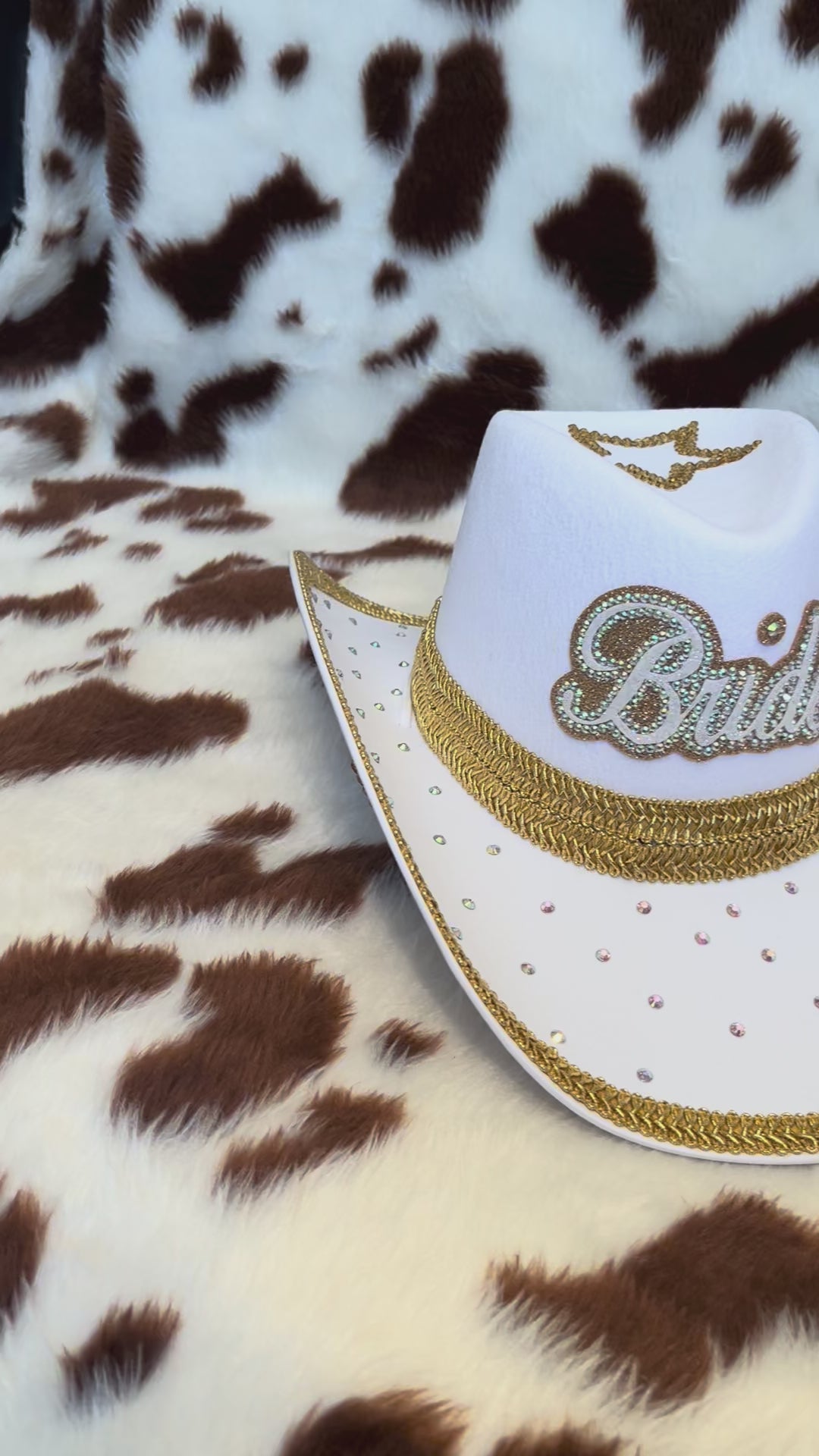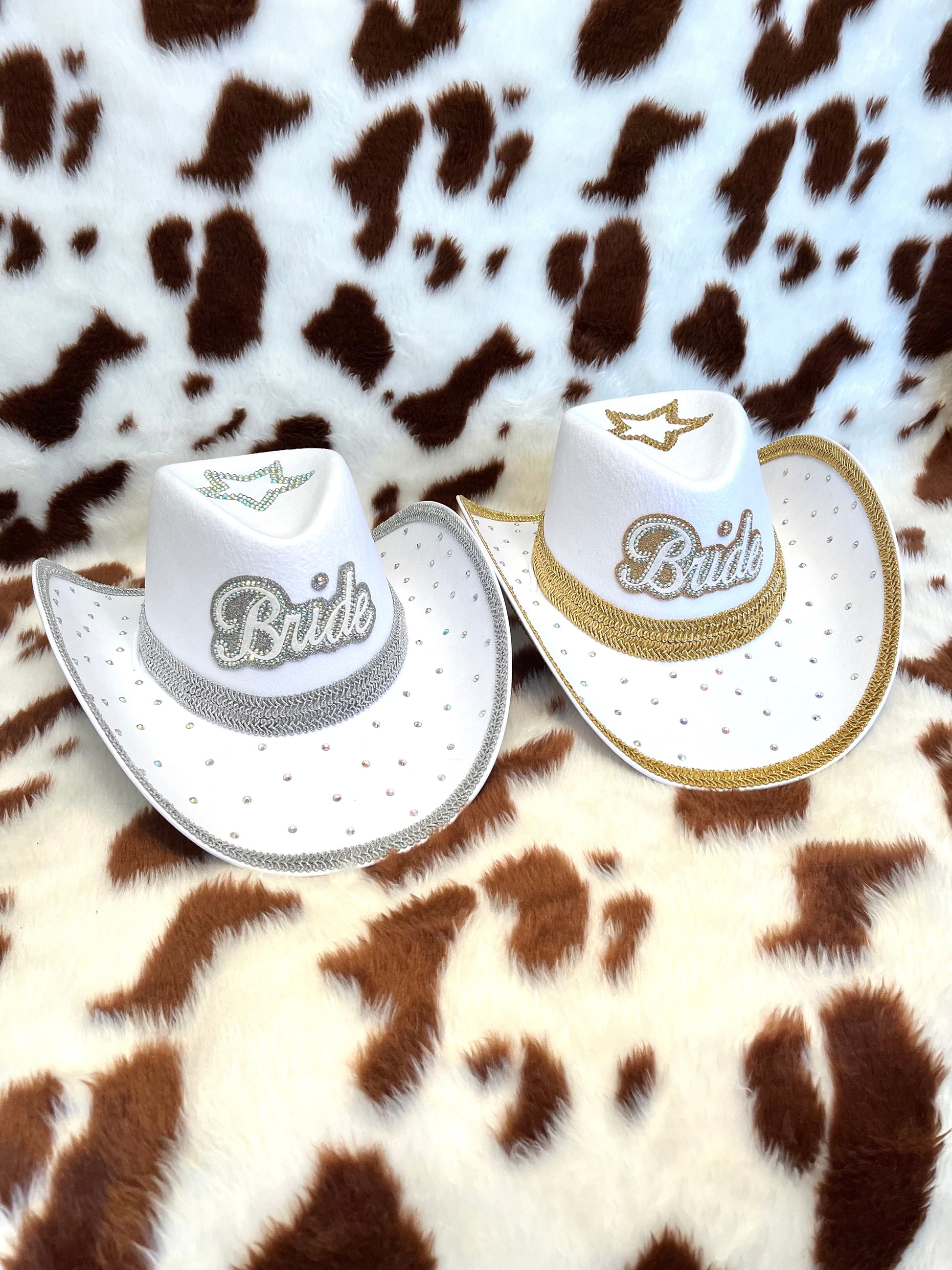 Choose from gold or silver accents, with the option to add a veil for that extra bridal flair. The front features 'Bride' in sparkling rhinestones, while rhinestone stars decorate the underside of the brim. Finished with a glam trim in your choice of gold or silver.