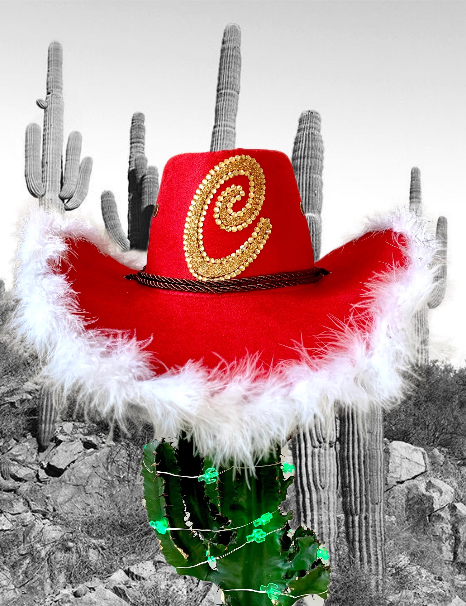 Step into your Christmas cowgirl era with this bold red velvet cowboy hat, finished with soft white feather trim and your choice of gold or silver glitter initial, outlined in sparkling rhinestones.