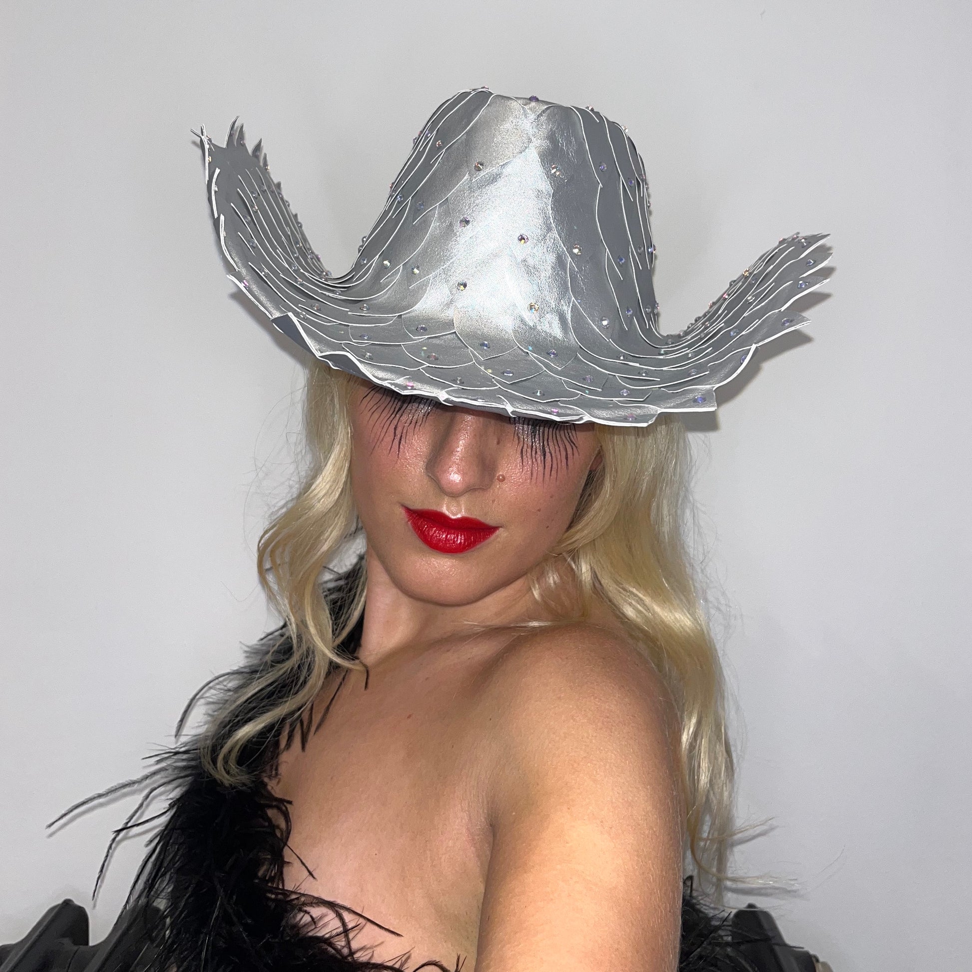 Handcrafted Metallic Silver Cowboy Hat with Faux Leather Scales