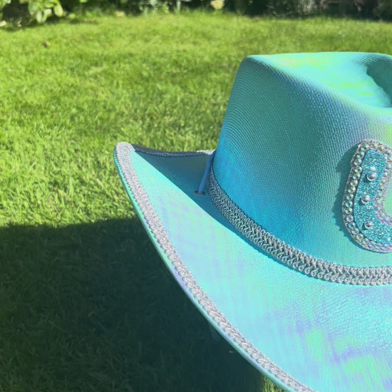 Shine bright in this bold metallic blue cowgirl hat, finished with a sleek silver braid and a sparkling rhinestone horseshoe front and centre — made for rodeo queens and party scenes!