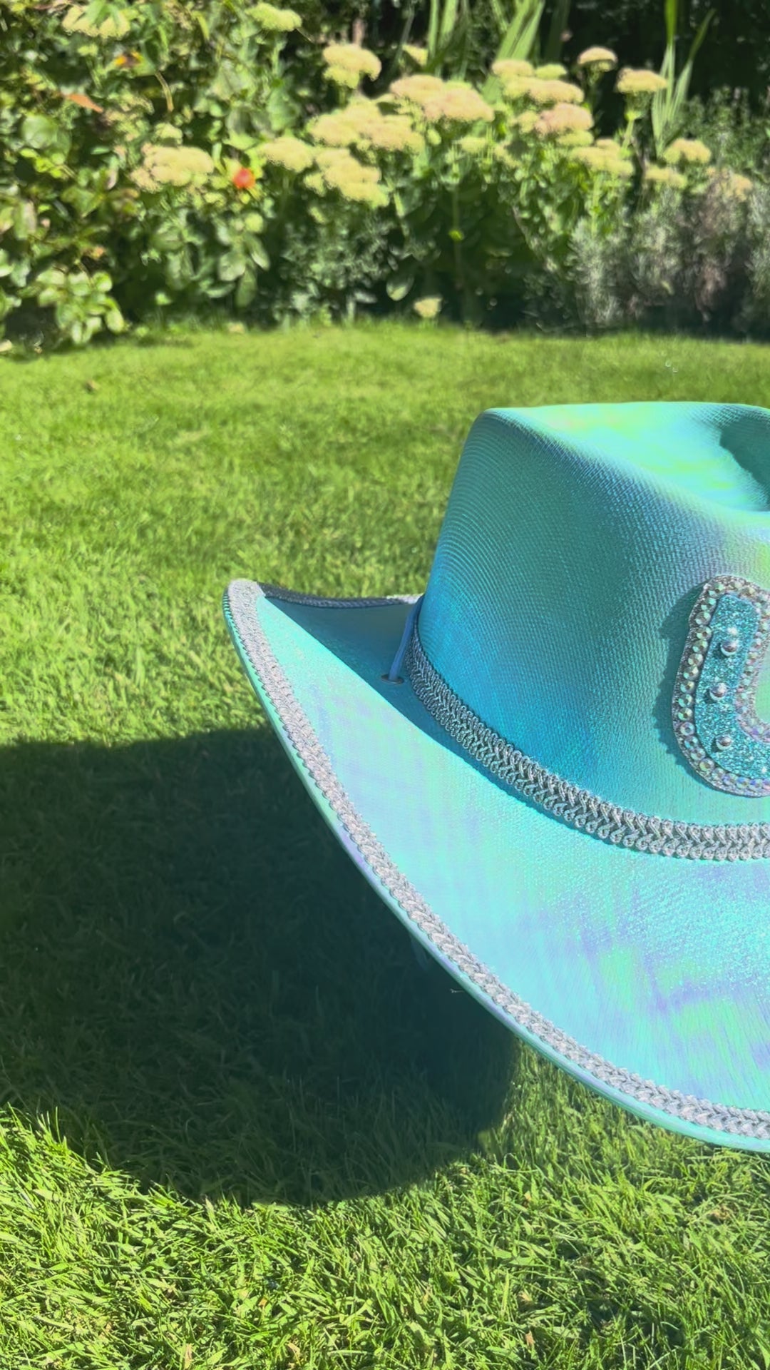 Metallic Blue Cowgirl Hat with Silver Trim & Rhinestone Horseshoe