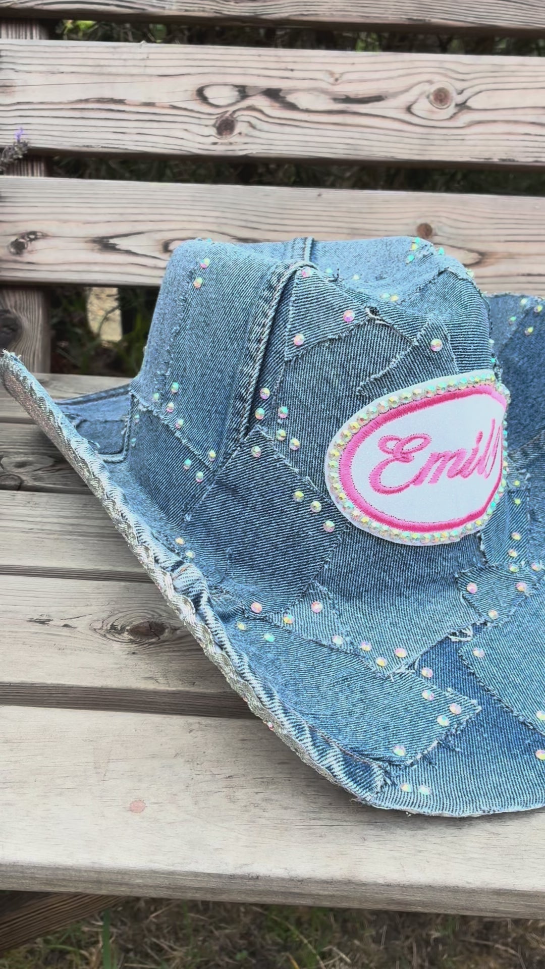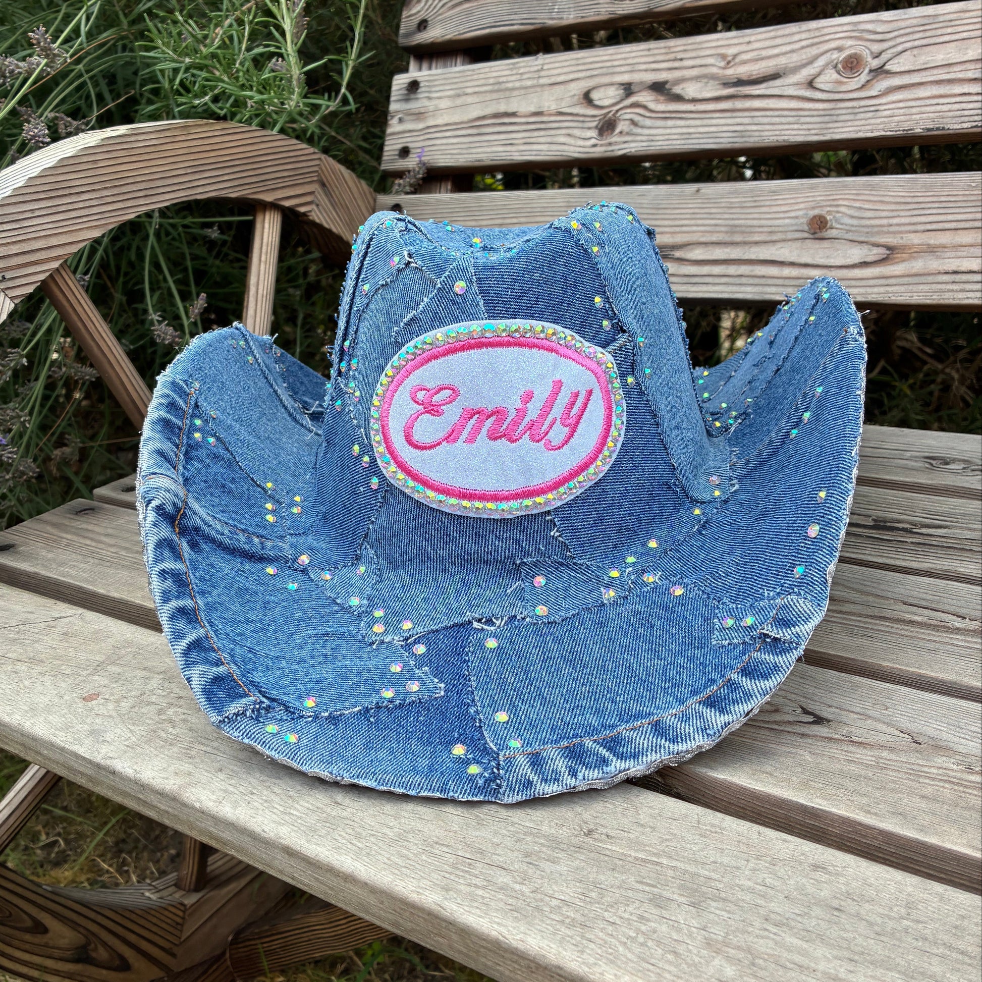 Make it personal – customise your recycled denim cowboy hat with a name, lyric, date, or special message of your choice.