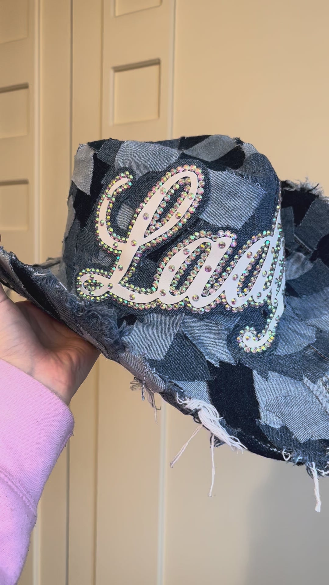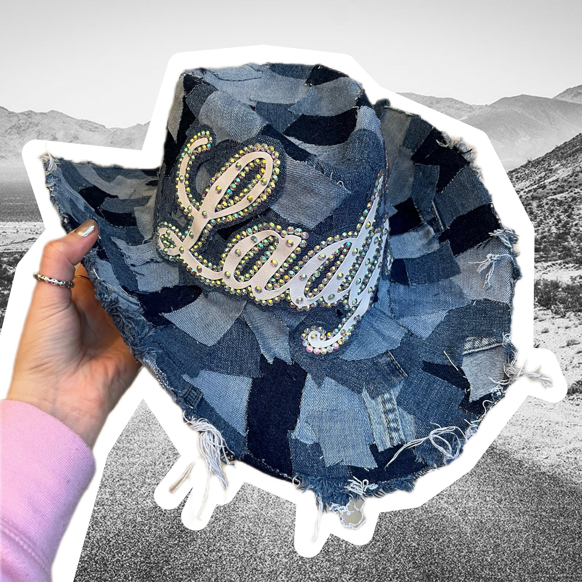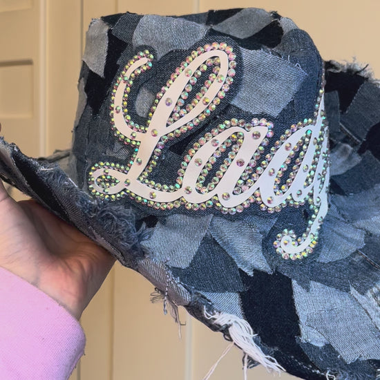 Crafted from a mix of repurposed denim in varying shades, each hat is one-of-a-kind and designed to pair perfectly with any denim outfit. Personalise yours with custom faux white leather lettering, finished with sparkling rhinestone outlines for that extra pop.
