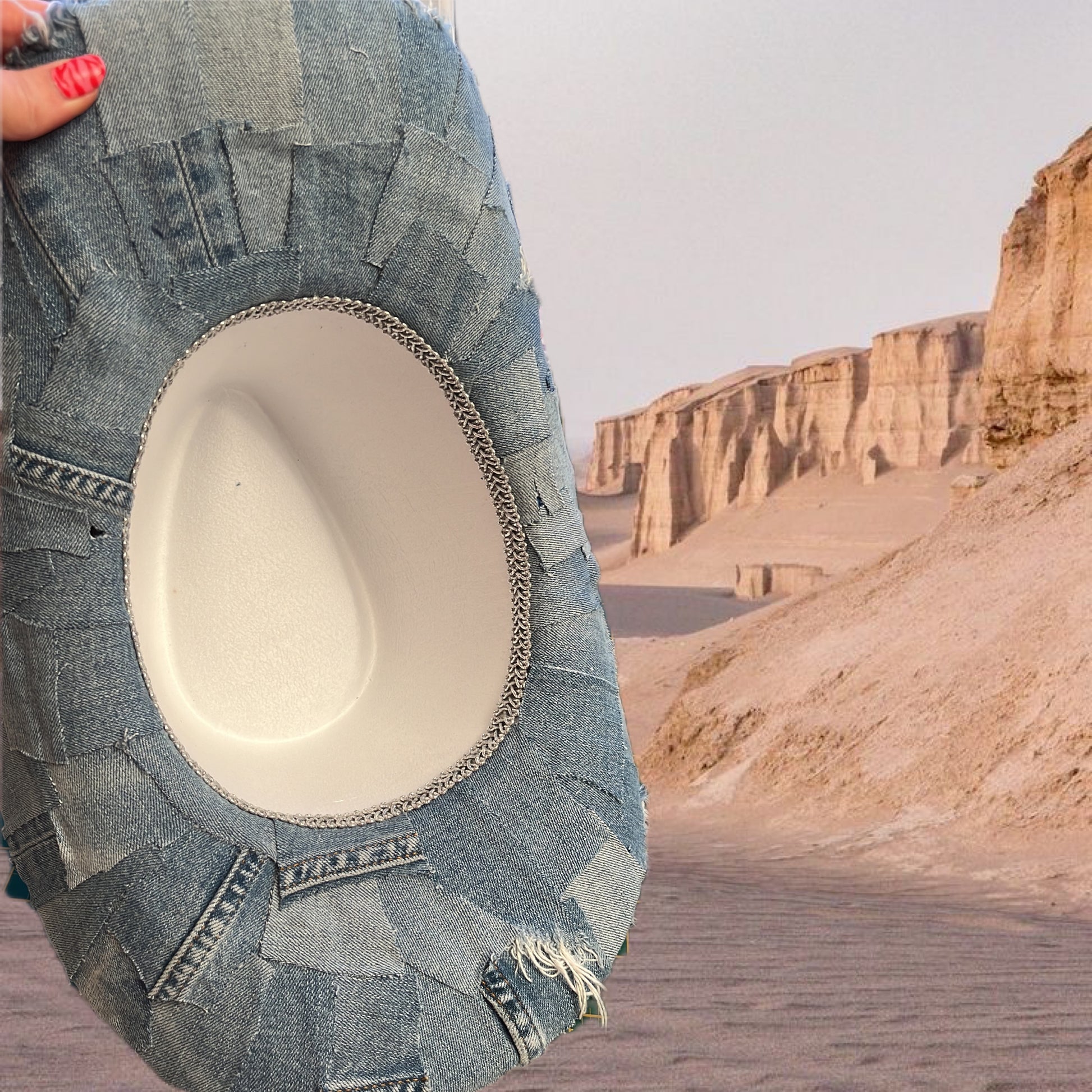 Shabby chic meets sparkle in this recycled midi-wash denim cowboy hat.