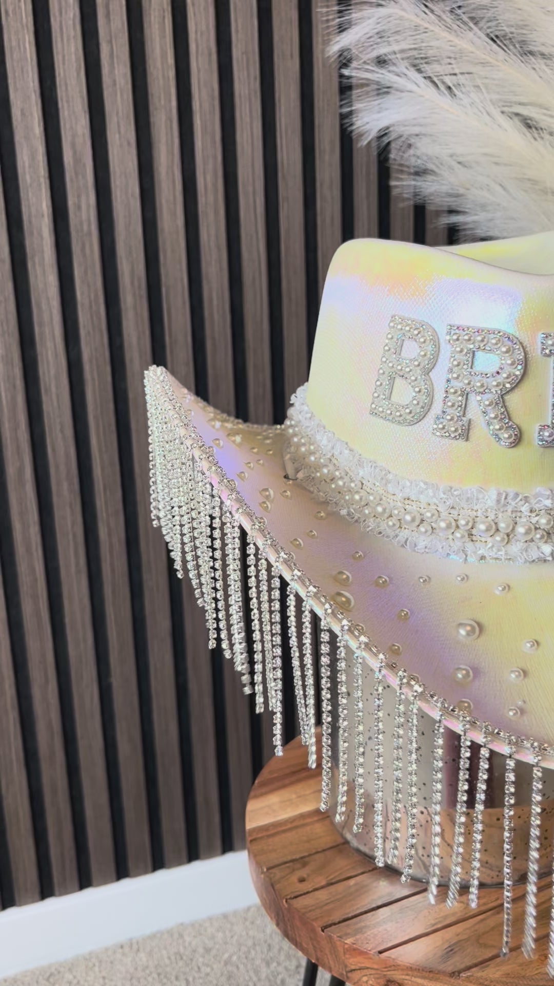 The brim is trimmed with elegant pearls and finished with a bold rhinestone fringe, perfectly complementing the glamorous hat band. It’s giving serious main character energy – just as your bride deserves.