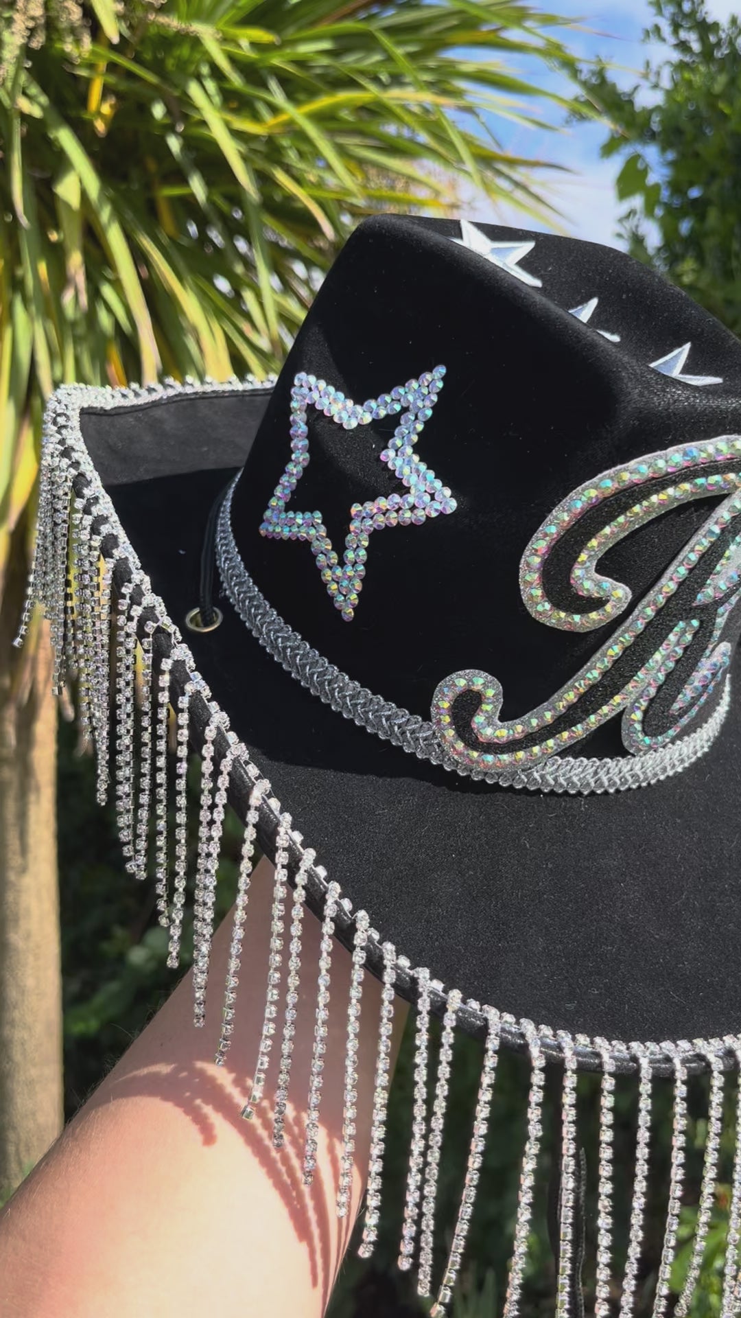 A sleek black cowboy hat, customized with your chosen rhinestone initial — a perfect way to mark a big birthday in style!