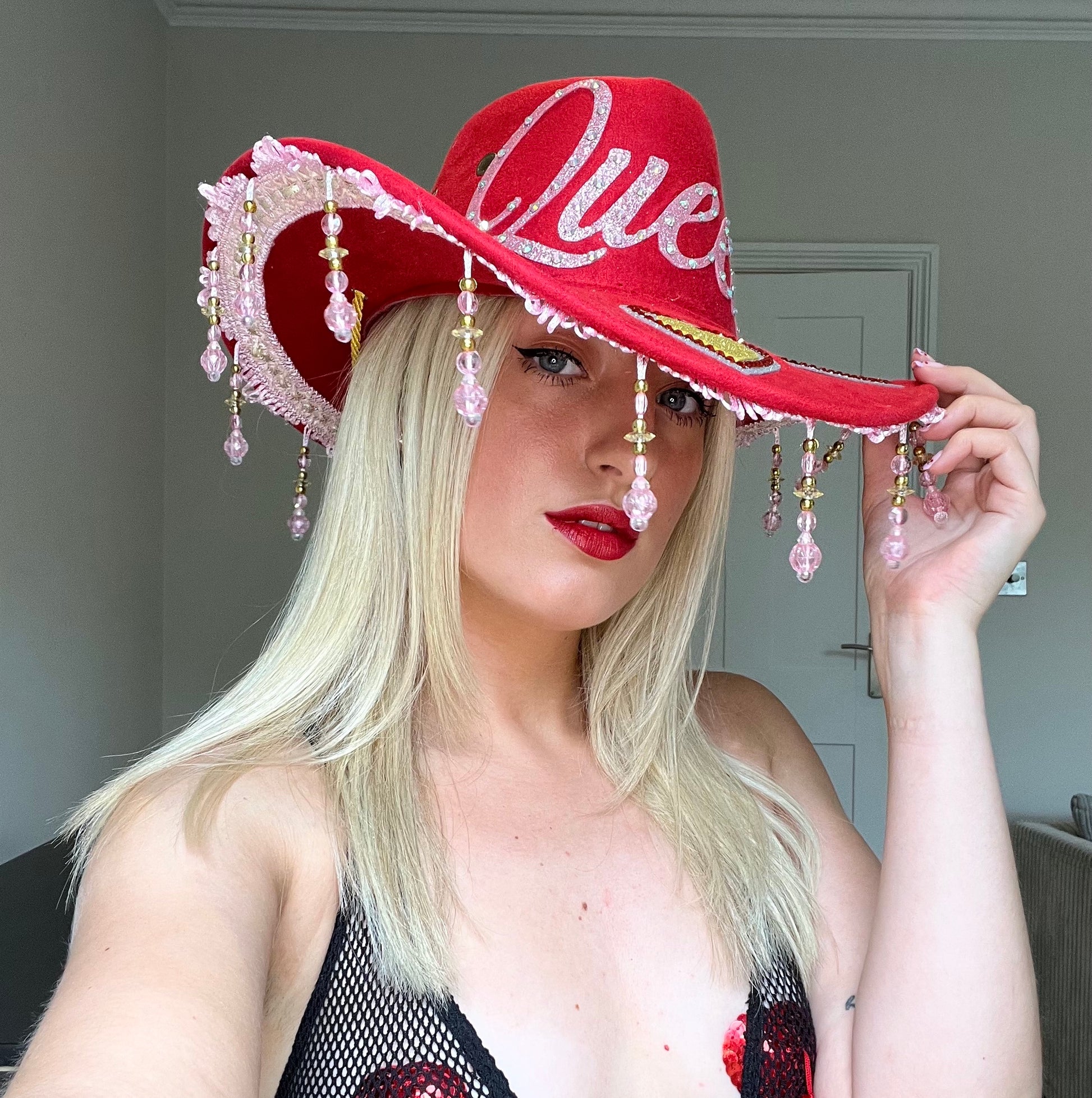 Bring the drama with this show-stopping red velvet-style cowboy hat, embellished with two-tone glitter love hearts, sparkling rhinestones, and finished with pink beaded fringe that moves with every step (or slut drop).