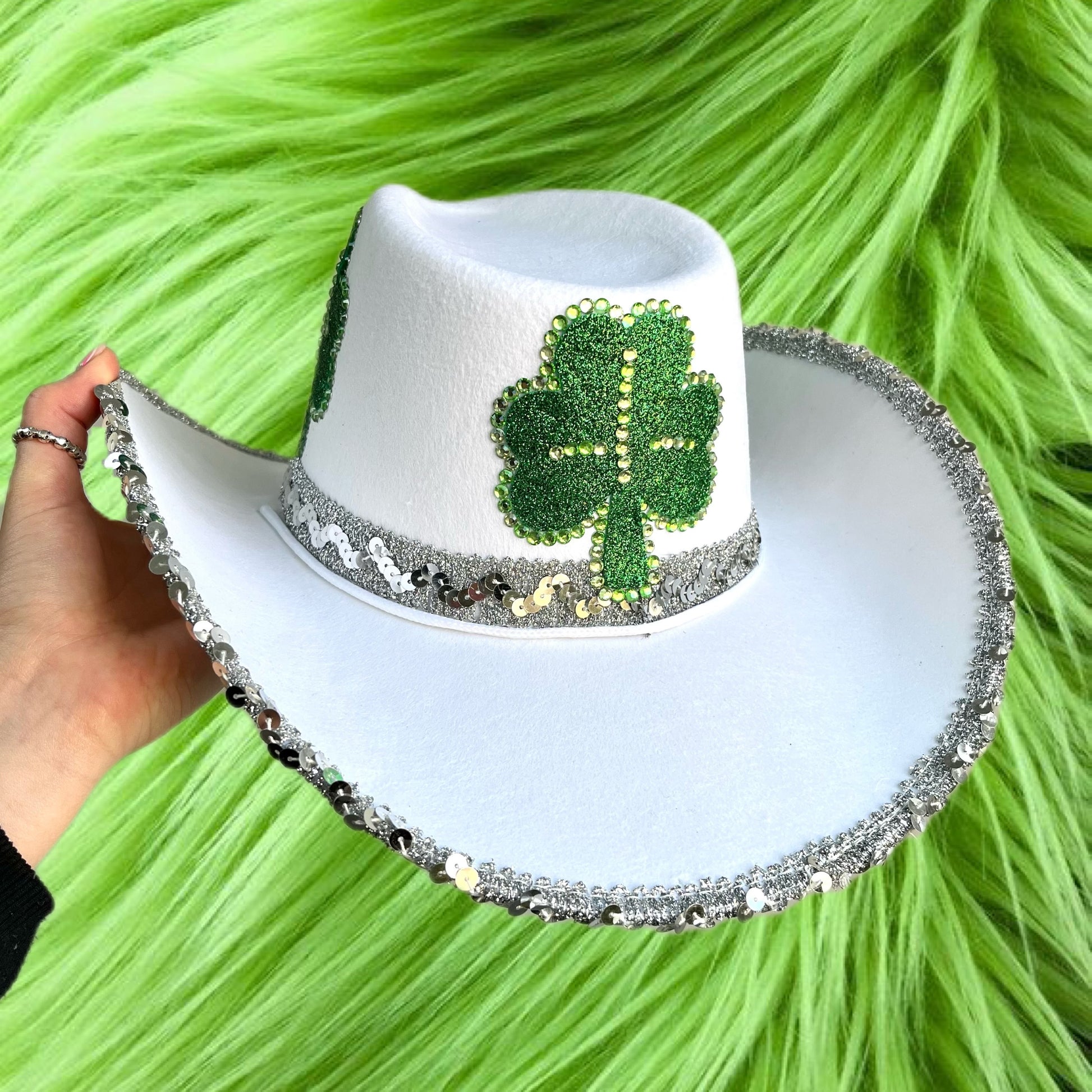 This personalised white cowboy hat is decked out with rhinestone shamrocks and trimmed in shimmering silver sequins — a festive head‑turner for your greenest moments.