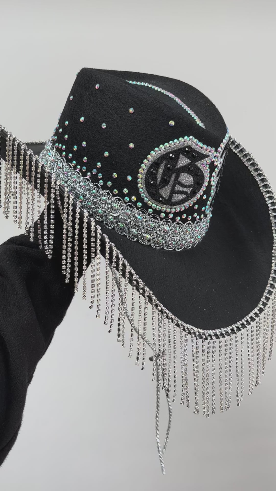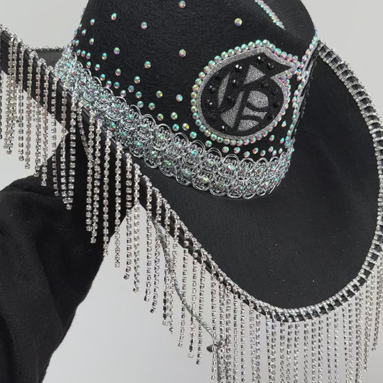 Originally designed for the ultimate badass, Gina Harrison, this sleek black cowboy hat is decked out with dazzling rhinestones and personalised with your initials or age in a bold, classic tattoo font โ made for the fiercest rodeo queens.