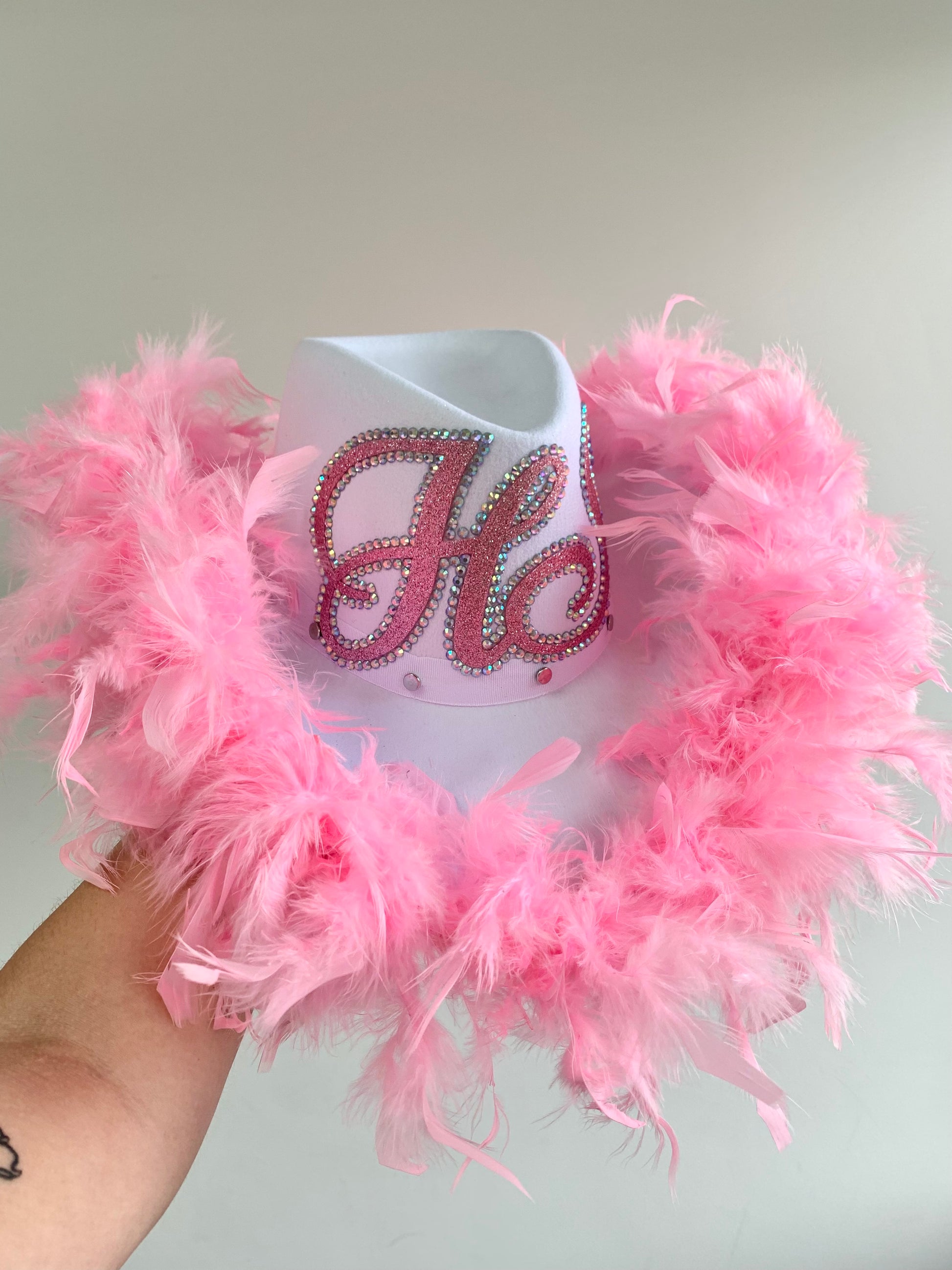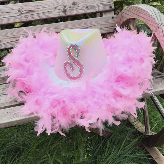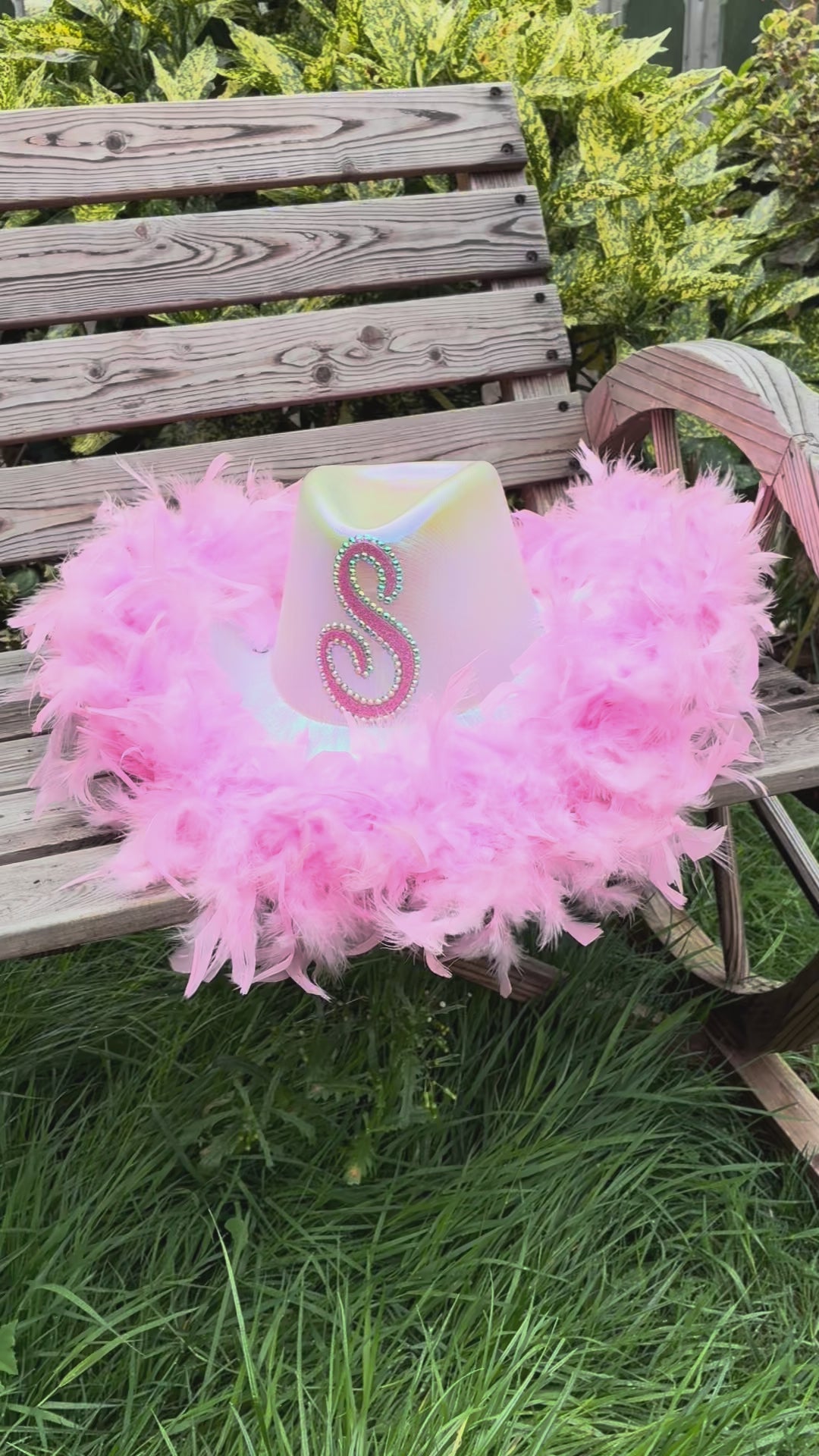 Channel your inner icon with this white Stetson-style cowboy hat, trimmed in soft baby pink or baby blue feathers and personalised with your initials in sparkling rhinestones front and centre.