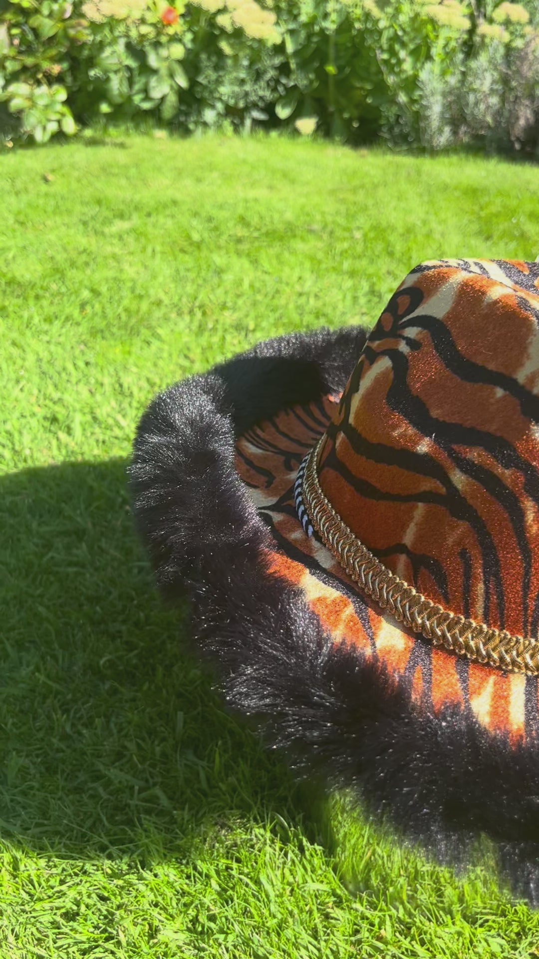 Unleash your wild side with this bold tiger print cowboy hat, finished with a sleek black faux fur trim and a sparkling rhinestone horseshoe front and centre — made to steal the spotlight at any rodeo, festival, or party.