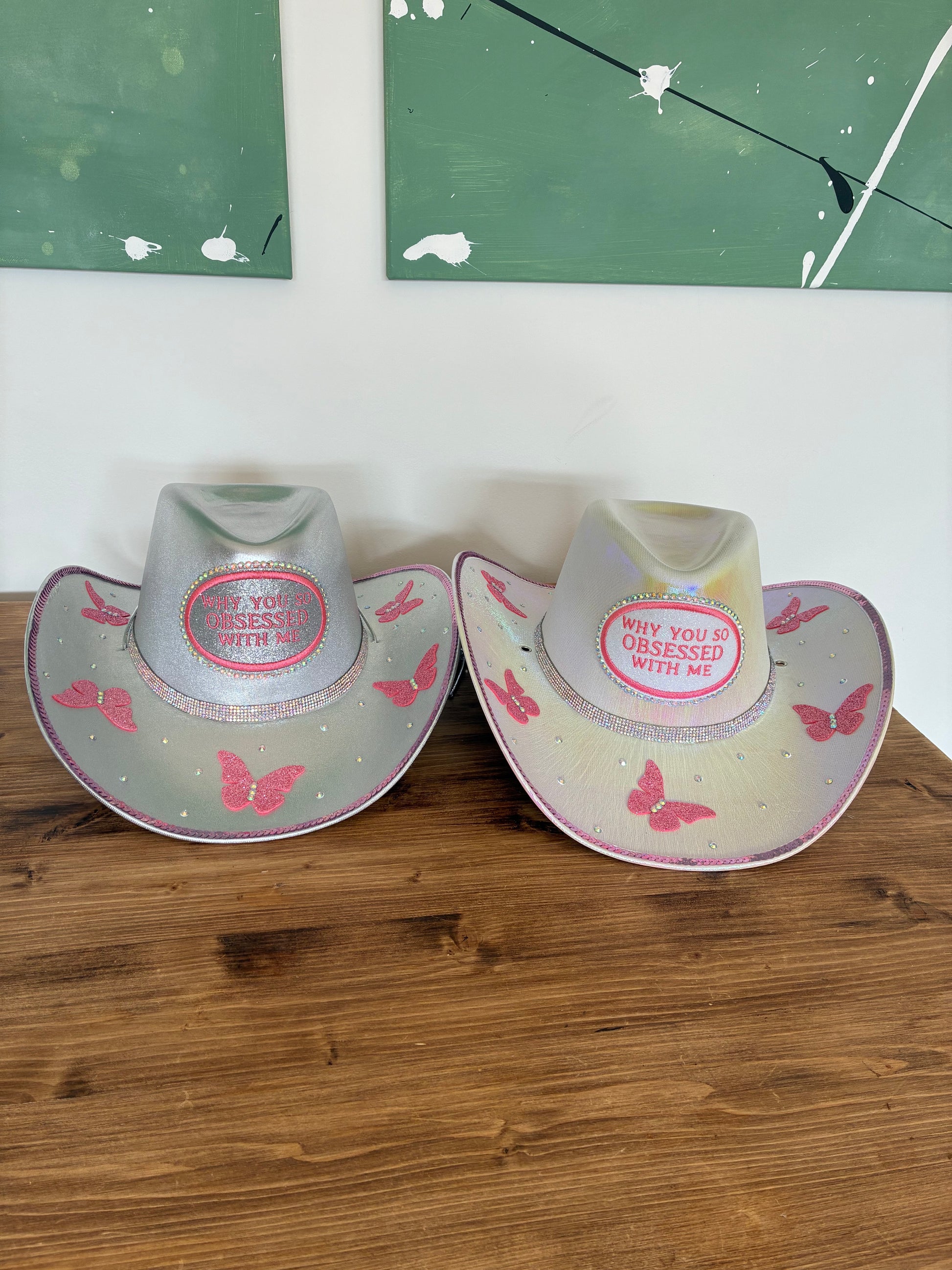 Make a statement loud and clear with this metallic cowboy hat, embroidered with the iconic words: “Why You So Obsessed With Me” — because subtlety is overrated.